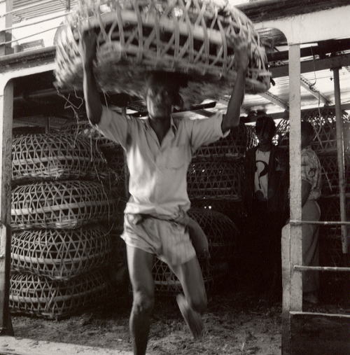 ヤンゴン港で船から積み荷を降ろすシーンです。竹かごの中に入っているのは、ニワトリです。他にもさまざまな荷物が積み卸しされるのですが、その多くが人力に頼っていました。