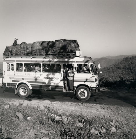ミャンマーにはヤンゴンとマンダレーとを結ぶ鉄道があるだけです。その鉄道も、保線が悪いのでダイヤ通りには走っていません。その他は、すべてバスと言うことになります。バスが重要な移動機関であり、輸送機関です。屋根の上に大きな荷物を積み、乗客を満員にして、曲がりくねった山道を走ります。