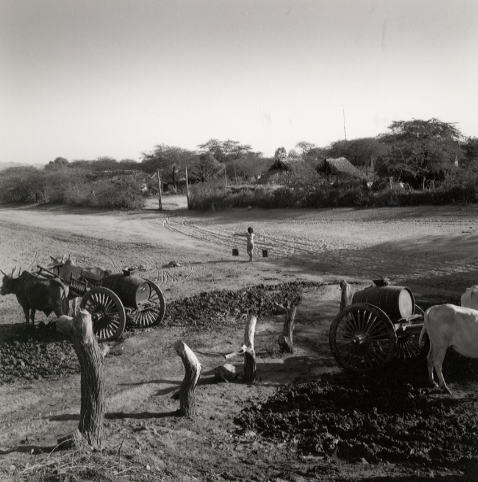 | 地方に行くと、電気はもちろん水道も引かれていません。集落のはずれにある水場まで、牛車が水を運びに行きます。この水といっても、我が国のような透明の水ではなく、茶色に濁っています。しかも、渇水期になると、この水も干上がってしまうことがあります。するともっと遠くまで行かなければならなくなります。 |
