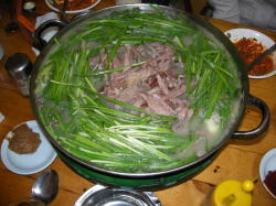 平べったい鍋の中央には、犬の肉が並べられ、その廻りにはニラやゴマの葉がならんでいる。