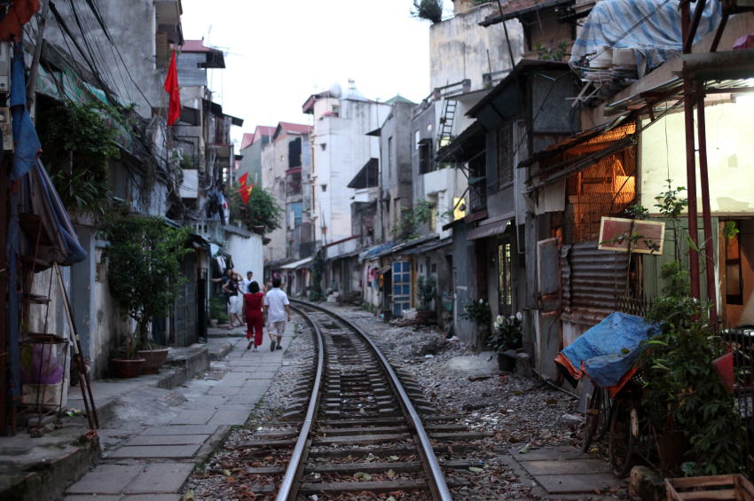 ハノイ駅のほうからホアンキエム湖の方角へと歩く途中で、町中の大通りを鉄道の線路が横切っているのにであった。我が国なら、遮断器があるだろうが、この踏切にはそうしたものはない。1日に通る列車も数少なく、線路に面した家々もゆったり構えている。もちろん、そこに生活するハノイの人たちも、線路際をゆったりと歩いている。