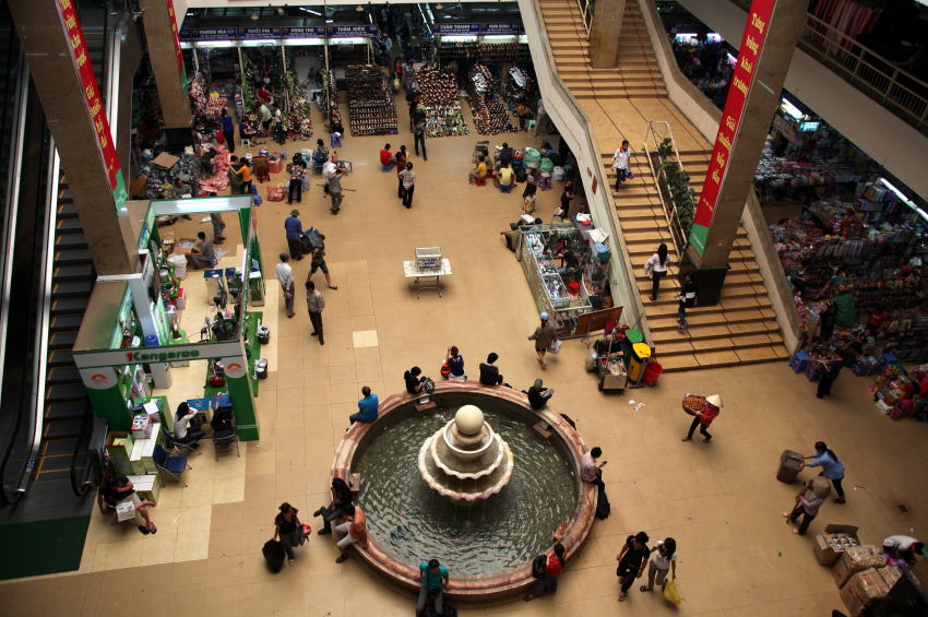 ドンスアン市場は3階建てになっており、中央には大きな吹き抜けがあり、それを取り囲んで商店が並んでいる。1皆には噴水があって、その廻りには人が腰掛けているが、ときどき警備員がきて立たされてしまう。