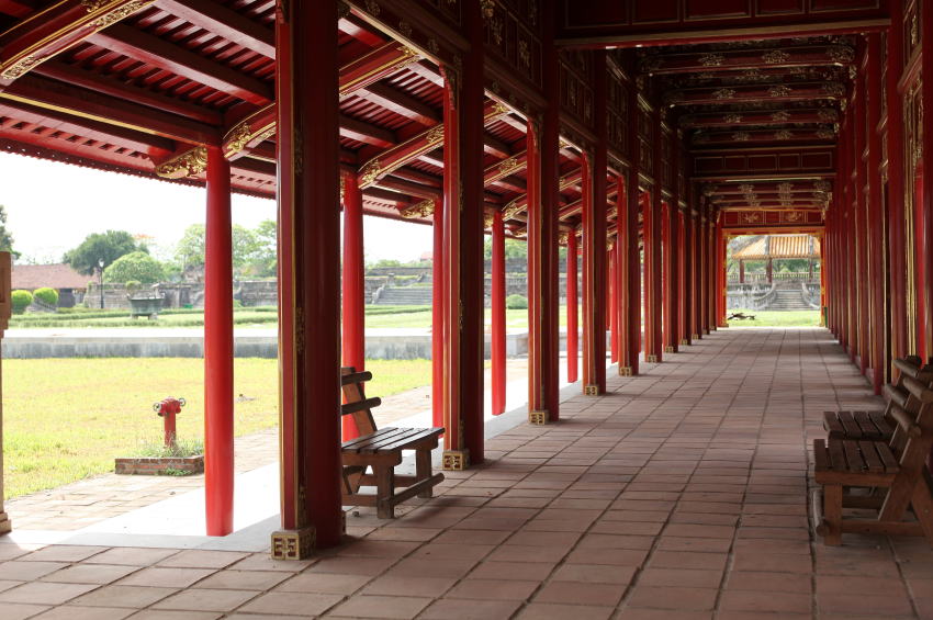 フエにある阮朝王宮である。王宮の中庭にめんした回廊が美しい朱色に塗られて、静かに佇んでいる。戦火に壊された部分もあるらしいが、いまでは修復されて艶っぽい華やかさを放っている。今でも他の部分では、修復が進んでいる。 この王宮は世界遺産にも登録されており、パンフレットにもそれが誇らしげに書かれていた。