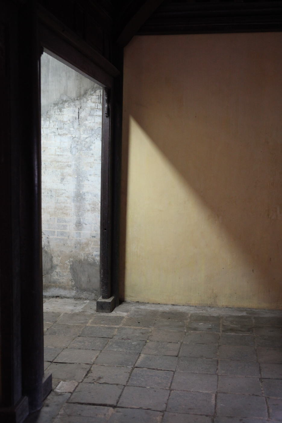 フエにあるトゥドゥック帝廟の奥の院の内部は、いかにもお寺らしくて静謐が支配している。時々訪れる観光客が破る以外、静かな空気が室内を満たしている。上の写真は、建物のつなぎと言ったらいいだろうか、渡り廊下言うには短い廊下だが、隣の棟から差し込む光が柔らかく壁に長げかけられられている。