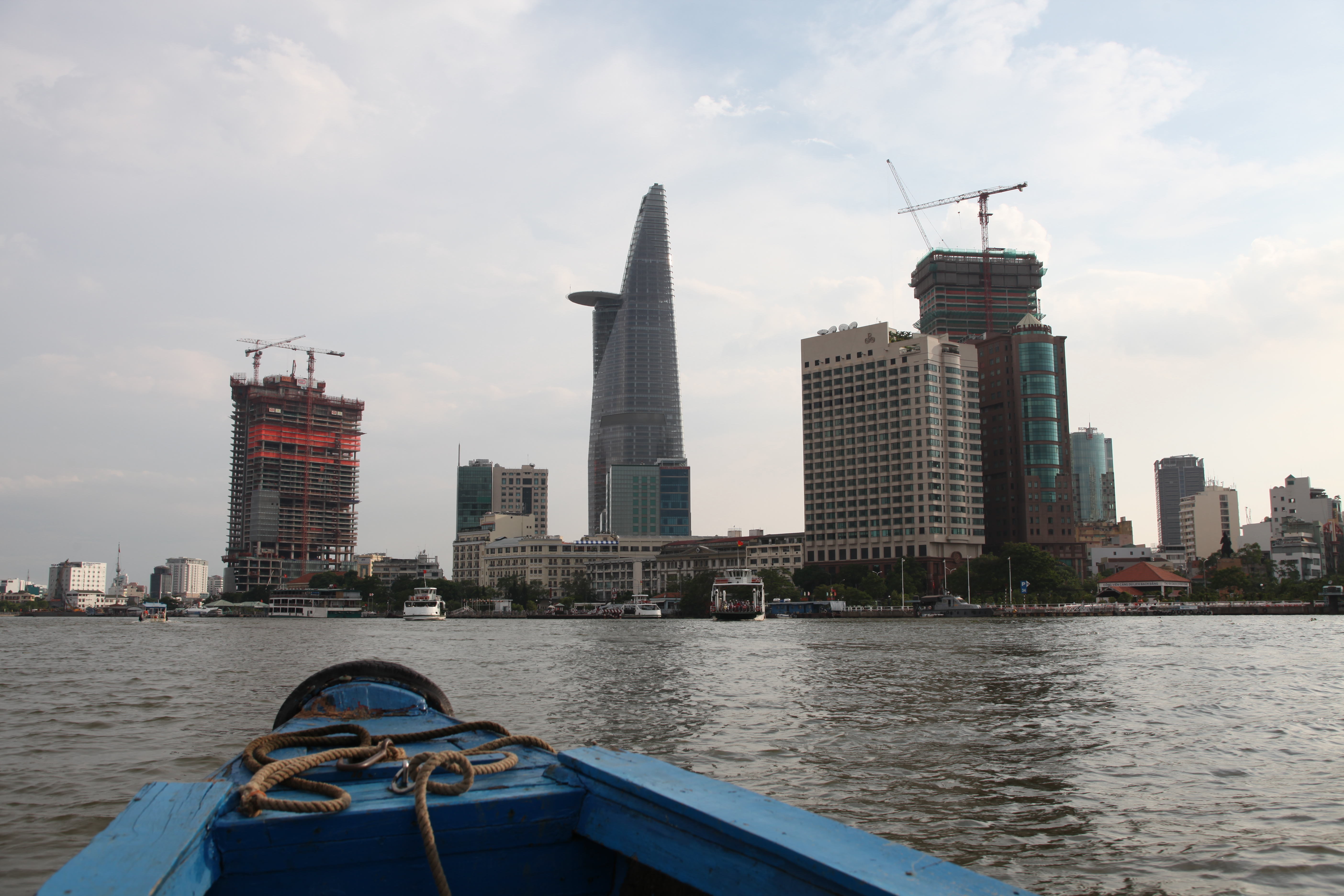 サイゴン川、こちらはホーチ・ミン川に変わってはおらず、古い名前のままである。サイゴン川から市内を見ると、まだたくさんの建物が建築中だ。かの有名なホテル・マジェスッティも、その佇まいはもはや古色蒼然としている。付近では5つ星のホテルが建築中だった。