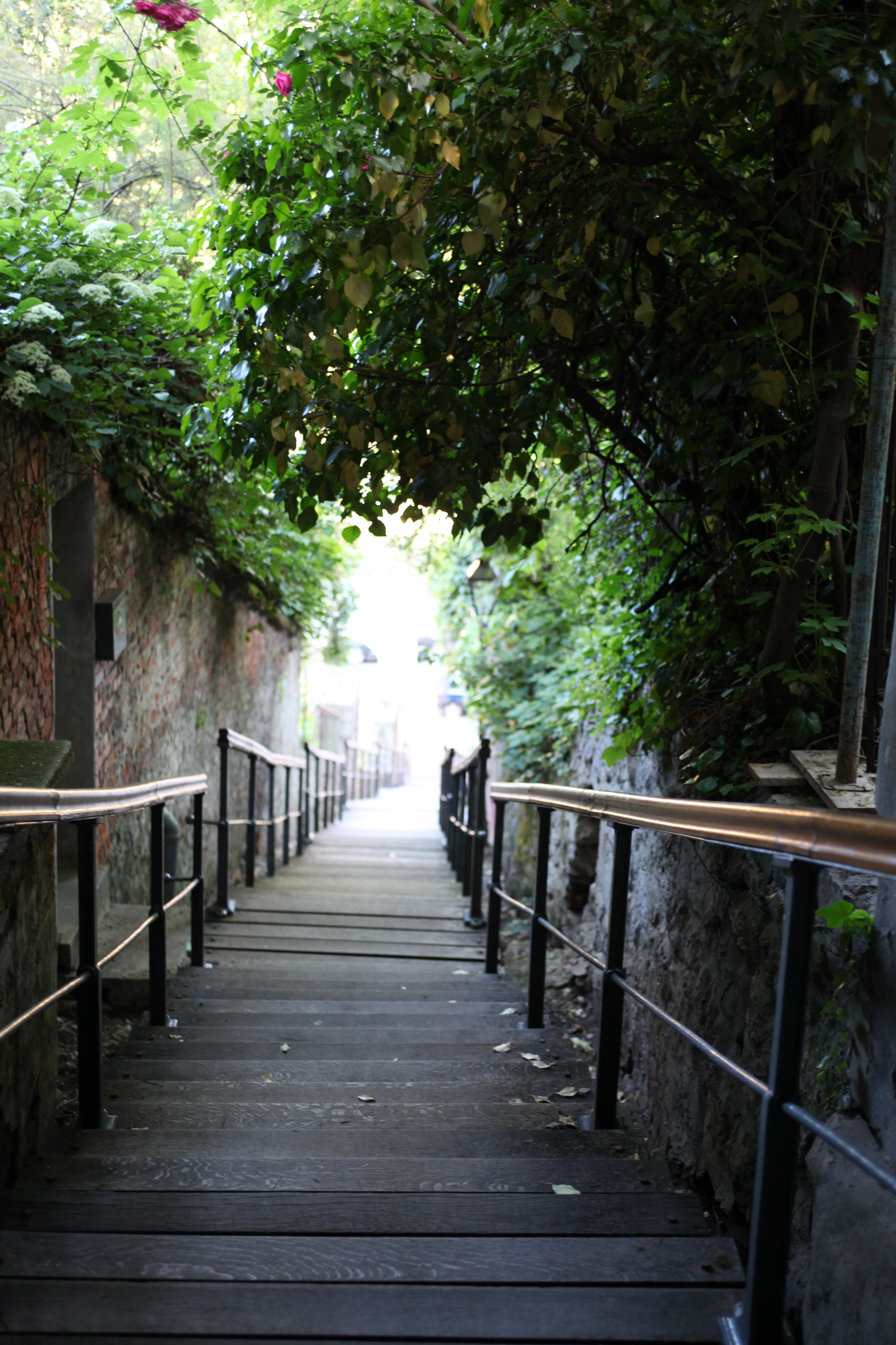 旧市街と新市街を結ぶケーブルカーの駅前にでる。時間もたっ たので宿へと戻ることにする。細道を下る。緑がしげり、木製の階段が下へと伸びている。その先には道路が白く光っている。時々車の走るの