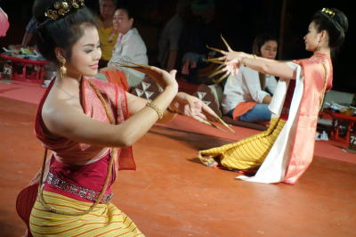 中央の平場の舞台を囲んで、地べたに座るように食事のセットがしている。 その周囲には椅子席が取り囲んでいる。 我々の予約は舞台に近い地べたの席だったのだろう。 しかし、長時間にわたって地べたに座るのは辛い。 初老人組は椅子席を希望した。 すると一番端のテーブルに案内されてしまった。 ビールを頼むと、何にするかと聞いてくる。 ビールの種類を聞かれたのは初めてで、ここは高級な場所なのだろう。 今まで飲んだことがないということで、チャーン(象印)とレオビールを各3本づつ頼む。 チャーンがやや濃い感じで、レオは軽めである。 メンバーの好みが分かれた。 シンハーが180バーツ、他は170バーツだった。 いずれにしても市中の3〜4倍くらいの値段である。 45センチくらいの木製の丸盆にのって、料理が出てきた。 丸盆の上には、10センチ程度の小さなお皿に、いろいろな料理が盛られている。 おそらくこれは前菜だろう、と全員が思った。 次々に料理が運ばれてくることを期待していた。 しかし、これですべてだった。 確かにタイ北部が裕福なはずはないから、満漢全席のような料理を期待するほうが無理だったのだ。 620バーツという金額の大部分は、舞台でまう美しい女性たちのタイ舞踊の料金だったのである。 タイ舞踊は1部、2部構成になっていた。 8〜9人の美女たちが優雅に舞う。 2組の踊り手が入れ替わり見せてくれる。 最後には盆踊りのようなものも披露されて、客の中から踊り手を誘い出して一緒に踊り始めた。 盆踊りの好きな我がメンバーも参加した。 見る人が見れば素晴らしい舞踊なのだろう。 しかし、素養のないメンバーはたちまち飽きてしまった。 1部が終わると、場所を変えて2部が始まるという。 2部は少数民族の舞踊らしいが、飽きてしまったメンバーが帰ろうと言い出した。 その声に吊られて、ここで帰ることになり、マイクロバスをだしてもらう。 翌日帰るという早帰りのメンバーがいるので、ホテルに戻るとお金の精算をした。 そして、まだまだ元気な初老人たちは、Sang-Som の飲み残しがあったので、夜の宴会へとなだれこんでいった。 隣の部屋から椅子を運び、車座になって夜は更けていった。 |