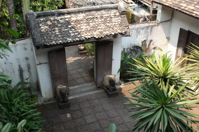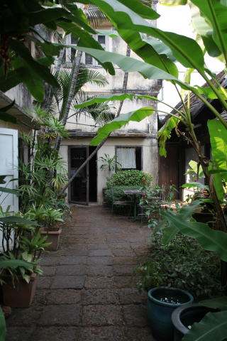 ソンテウでナワラット橋に向かう。 また右に折れてしまったので、運転手に反対だというと、助手席に乗れという。 一度来ているので、大いばりで道案内する。 建物が見えてきたあたりで、全員が下車。 古い建物に客はいなかったが、当たり前に開店していた。 中に入ると、なかなかにシックで良い雰囲気である。 150年近く建っている建物だという。 おそらく金持ちが建てたのであろう。 中庭を持った2階建てで、高級そうな絹製品がさりげなく並んでいた。 50パーセントオフだというので、スリッパを3足買ってみた。 ここで2グループに分かれた。 我々は4人でトクトクに乗ってホテルに戻る。 トクトクは3人まで乗れると思っていたら、運転席の隣にも乗せるので、4人まで乗れるようだ。 ただし、運転席の隣にはバッテリーがあり、バッテリーの上に仮設のクッションを置いて椅子とするのだ。 しっかりと捉まっていないと、転がり落ちそうである。