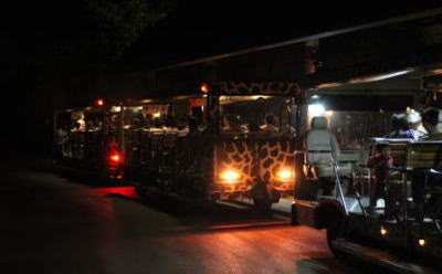 タイガー・ショーが行われているというので、虎の檻のほうへと歩いて行く。 あたりは薄暗く何だか不気味である。 大勢の人垣ができており、その先には大きな檻があり、白い虎がショーの最中だった。 しかし、10分とたたないうちに終わってしまった。 今日のタイガー・ショーはこれで終わりだという。 ガッカリ。 チップを渡した人が、順に檻の中に入っていく。 虎と頬ずりしながら、虎とのツーショットに納まっている。 しかし、皆が皆こわごわ、恐る恐るで、その様子がおかしい。 お金を払って、虎の隣まで行ったのは良いが、間近で見る虎はすごい迫力なのだろう。 薄暗い中を中庭に戻る。 東南アジア各国の服装に身を包んだ美女たちが、照明に照らされながら舞踊を見せている。 皆スタイルも良いし、すごい美人である。 カトゥーイらしき人も混じっているのが、いかにもタイらしい。 夜のサファリを周遊するバスが出発する時間である。 タイ語で案内がつくバスと、英語版のバスがあり、とうぜん英語版のバスに乗る。 5分もしないうちに出発である。 ほぼ真っ暗といったなかで、バスは静々と進む。 突然に、ガイドさんの声が聞こえる。 しかし、訛りが強く、動くバスの両側に見るべきものが現れるので、なかなか聞き取れない。