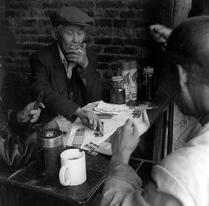 カーテンがゆれた。 その隙間から覗かれる部屋は、3畳もあるだろうか。 壁の片側にはベッドのような物が置かれ、下着姿の女性が座っていたりする。 テレビ もある。 突然に見せられた部屋のしつらえに、僕は少し戸惑いながらなおも奥へ奥へと歩いていく。 ちょっと壁が空にぬけた。 狭い部屋が、路地に開いている。 この部屋と僕のあいだには、ちょっとした温度の違いがある。 それでも馴染みのある空気だ。 中年の女性と目が合うと、どちらからともなくにこりと笑う。 あれほど煩かった表通りの喧噪はまったく伝わってこない。 曲がりくねった路地の途中では、男たちがカードに興じている。 それをとりまく何人かの岡目八目たち。 僕も興味津々でのぞき込む。 にやっと笑う顔と顔。 にやっと笑ったここで、気持ちが通じているのだ。 男とは単純で愚かなものだ。 もうカメラを向けても許してくれる。 写真に写させて貰う。 しばらく観察して、また歩き始める。 路地の巾はもう1メートルとはない。 両側の壁は身近に迫って、室内からの空気が路地へと流れこんでくる。 「公電」と書かれた紙が壁に貼りついている。 これらの家には、まだ電話がないのだろう。 赤い小さな電話機が、家の軒先に針金でくくりつけられている。 「公電」とは公衆電話のことらしい。 上の方から水し ぶきが落ちてきた。 左へと曲がった路地は、行き止まりだった。 路地の巾はひどく狭くなっている。 窓から手が伸びてくれば、僕は捕まれそうなくらいに狭いところに彷徨い込んでいる。 振り返ってみれば、上の方から光が落ちていて、僕のいるところが明るく照らされいる。 これ以上進むことはできない。 仕方なく引き返すことにする。 途中で老人とすれ違う。 彼は訝しげに僕を見た。 路地の入り口から、彼は僕のあとについてきていた。 ここの住人だろう。 軽く会釈する。 しかし、彼は怪訝な姿勢を崩さない。 凝縮した都市の住居は、古くからの街である。 密集した部屋の集積。 目の前に見える部屋には、たよりなげな裸電球が一つ天井から下がって、辛うじて明かり が見える。 そこは暗く不潔で埃っぽい。 前近代の密集した住宅では、多くの人が住むことが最優先される。 快適な換気や採光をとることは、まだ考えられてはいない。 上に伸びた建物の隙間には、わずかの光しか落ちてこない。 人は室内から路地へとはみ出してくる。 路地が室内の延長でもある。 隣りあって住む人たちが作 る、濃密な居住環境。 夕食に食べるものから夜の生活まで、互いにすべてを知り合っているのだろう。 だからもちろん、よそ者の侵入はすぐにわかる。 来た路地を引きかえす。 男たちの遊ぶところまで来ると、反対側の路地へとふたたび迷いこむ。 ガラス越しに見える室内には、テーブルの上に麻雀のパイが散乱している。 雀卓が3台ほどある。 誰もいない。 雀荘なのだろうか。 子供たちの声がする。 路地の中に小学校があるらしい。 その声に導かれて路地を進む。 小さな幼稚園があった。 子供たちは昼御飯の準備をしている。 なおも進むと、小学校が見えてきた。 僕は裏から小学校に近づいていたのだ。 狭い路地から、巾5メートルくらいの広い道にでる。 右手には小学校の正門がある。 小学校の前は、差し掛けの商店街がずらっと並び、屋台の売店も軒を連ね ていた。 屋外である路地が室内でもある都市の共同体。 そこに生活する人々の体臭が、路地の空気に濃密な色をつけている。 路地からでた僕は、そこで緊張の糸 が少しほどけた。 乾燥肉を天秤に吊して担いだ男が2人歩いている。 それを呼び止める中年の女性。 軽自動車が行き交い、ほこりを舞いあげる。 両側に並んだ売店を冷やかしながら、なおも歩く。 そろそろ腹が減ってきた。 幼稚園の食事を見たせいか。 昼になったらしい。 道行く人たちが、白い発泡スチロールの箱を手にしている。 あれは弁当だろう。 日用の細々とした物を売っていた売店が、食べ物を並べた 食堂へと変わってきた。 あたりの匂いがかわる。 道がぐっと左へ曲がり、道幅が広くなった。 両側には屋台の定食屋さんがならび、人々は昼食の買い物に忙し い。 目の前の屋台では、直径30センチくらいのお皿に、調理されたおかずが山盛りになっている。 10種類ではきかない。 新しい料理も運ばれてくる。 路上とい わず、室内といわず、幾つもテーブルが並び、10人くらいの人たちが食事をしている。 僕も食事にすることにし、そのうちの1軒にはいる。 こちらでは、どの椅子に座ってもかまわないし、どの屋台に注文してもかまわない。 どのテーブルへでも届けてくれる。 お互い様なのだろう。 屋台のおかずを指さして、お皿に取り分けて貰う。 1品が1元で何種類注文しても、すべて同じお皿の上に盛り合わされる。 味が混じる、そんなことには無頓 着である。 僕は3種類ばかり注文した。 それが僕のテーブルへ運ばれる。 それにご飯とスープがつく。 テーブルにお