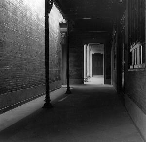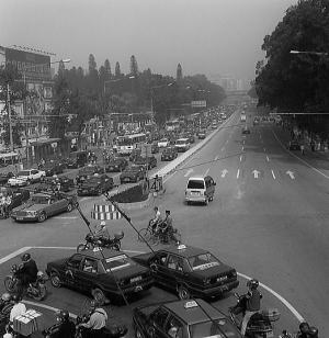 越秀公園のまえで降りる。 少し戻って、横断歩道橋をわたる。 中国の横断歩道橋は交差点の上 に、X型にかかったものが多い。 これだと、交差点の中心に立つことができる。 北にのびる解放北路は、遙かかなたまで車でびっしりと埋めつくされている。 西漢南越王墓博物館は、解放北路に面して建っていた。 2200年前の前漢時代、南越国の文帝の石室墓である。 これは1983年に偶然に発掘されたとあり、館内には石室墓が復元されて出土品が展示されている。 入り口から最上階まで、建物の中央を一直線に階段がはしっている。 大胆な平面計画で、こうした階段のあつかいはわが国ではあまり見ない。 1時間くらいかけて丹念に見る。 次に行くところは、陳氏書院である。 約100年前に、広州の陳姓の人たちが、お金をだしあって造った書院である。 典型的な中国南方建築の様式を採用した建物で、きわめて保存状態が良い。 ここでは南方貴族の生活が彷彿できる。 現在は広東民間工芸博物館として使われている。 ここは行き方が判らないので、タク シーに乗る。 タクシーの運転手さんに、広東民間工芸博物館と書いた紙を見せるがわからない。 陳氏書院ならわかるのだろうが、僕はそれに気がつかない。 広東民間工芸博 物館の紙を何人もの運転手さんに見せる。 やっと頷いてくれる人が現れ、タクシーが走りだす。 陳氏書院には着いたのだが、運転手さんは裏口につけてくれたのだった。 細い路地を通って裏口から陳氏書院に入る。 裏口にはおばさんがおり、入場券を買ってこいと言う。 すでに中庭には入っているのだが、入場券は正面入り口にしか売ってないので、僕は正面入り口に向か う。 その間おばさんは、僕が切符を買わないと疑ったのだろう、ずっと僕を監視し続けていた。 そして、僕が切符を買うのを見届けると、満足した様子で部屋に入っていった。 陳氏書院は日の字型の間取りで、中庭を渡り廊下が横切っており、床は石敷きである。 高い天井にすき間だらけの壁。 開放的なつくりで、至るところに精巧な 彫刻が施されている。 建築が手作りされていた時代のものだ。 工業製品が作る今日の建築では、もう見ることができない。